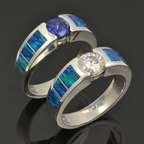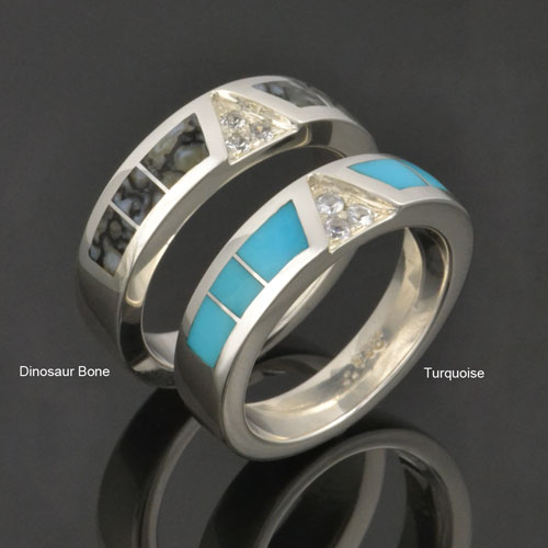 Hileman Silver Jewelry creates top quality inlay jewelry in gold and silver. We are a father and son team with a focus on creating a quality product at an affordable price and providing outstanding customer service before, during and after the sale. Our handmade jewelry features unique inlay stones such as dinosaur bone, spiderweb turquoise, sugilite and many other colorful stones sometimes accented by sparkling gemstones like topaz, sapphire, diamonds or moissanite. All of our wedding and engagement ring designs are highly customizable. You are welcome to choose any of the inlay materials or gemstones you see on our website and arrange them in any order you like in the metal of your choice. We look forward to working with you to create the ring of your dreams! You will need to plan ahead and allow us 4 to 6 weeks to create your new made to order wedding set or engagement rings.