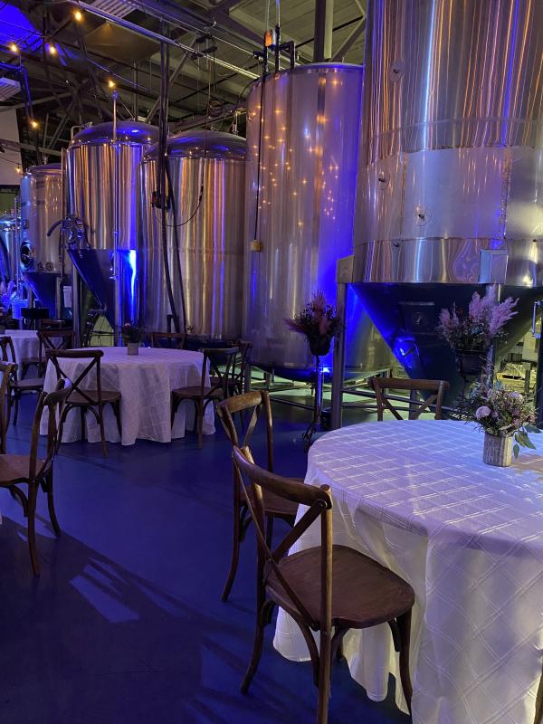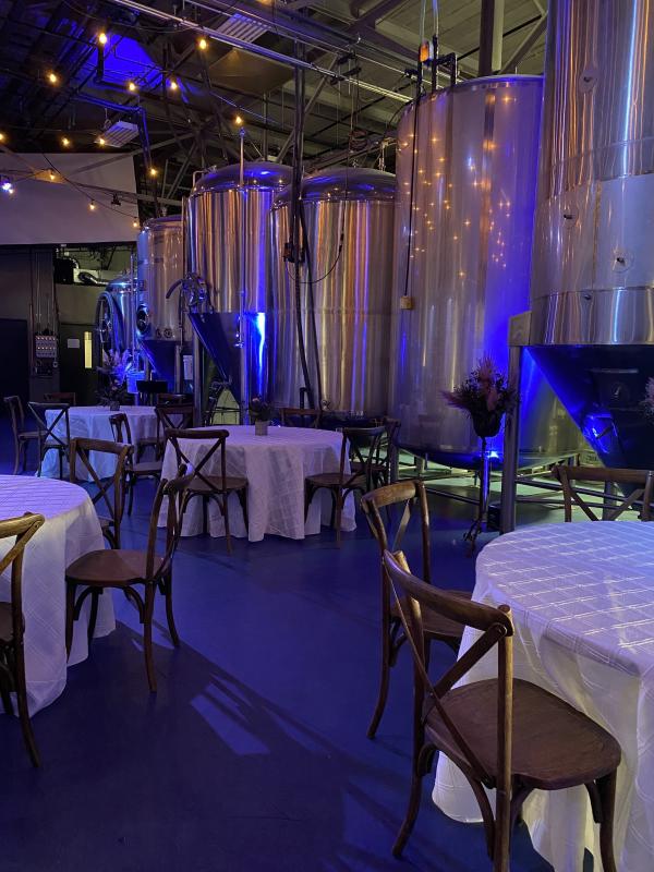 Host among the tanks in the brewery for a custom, private experience! Perfect for traditional rehearsal dinners, large welcome parties or engagement parties, ceremonies, and receptions. The brewery is a private space that can accommodate up to 90 guests for a seated dinner or 125 guests for a cocktail style event. Your brewery buyout rental includes a private bar and dedicated staff, your desired furniture set up, black linens, a sound system, wireless mic, cafe lights, and uplighting. Add the adjacent parking lot for outdoor space, guest parking or both!