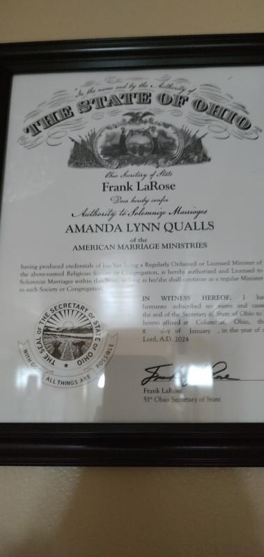 Amanda is self taught, solo wedding officiant working from home, offering a variety of ceremonies with no discrimination. Appointments are required, with at least 2 hours notice for last minute ceremonies. Amanda stays in contact through text, phone, email and video chat for up to 4 months before the ceremony. Ceremony start at $300 depending on your preference. Clients are encouraged to leave a Google review and photos of the ceremony will be posted on social media. Contact Amanda at 740-575-5909 for details and booking.